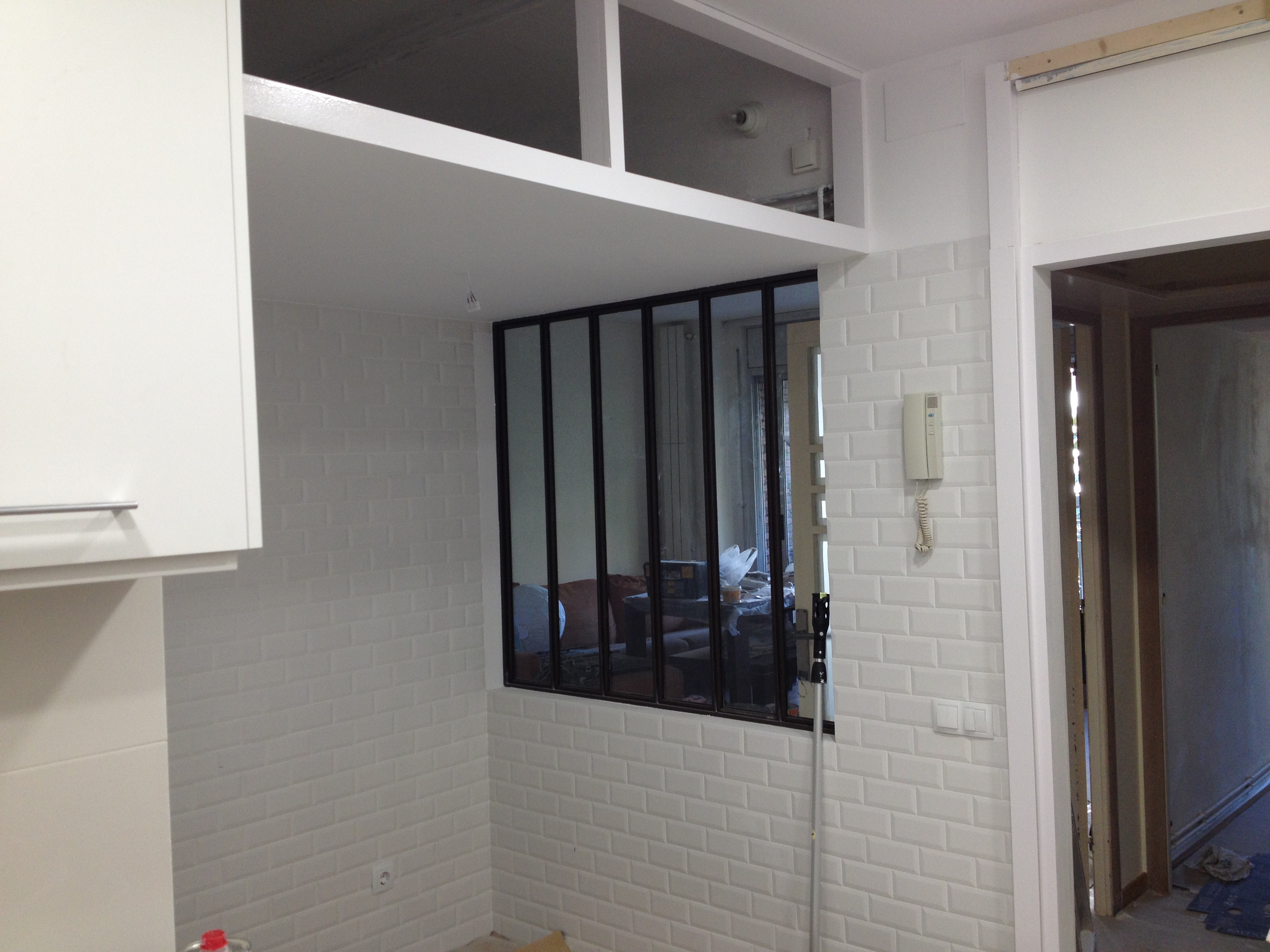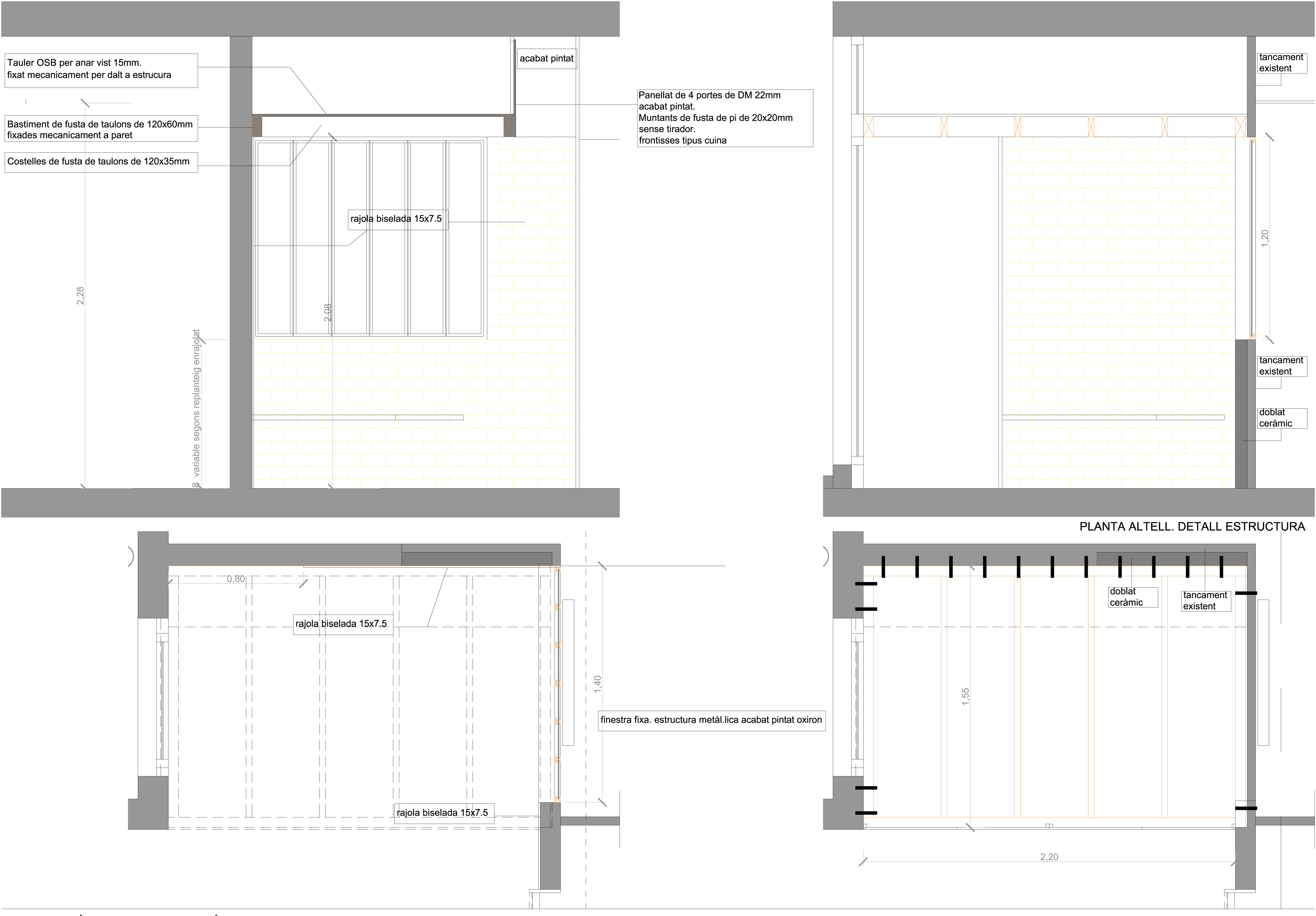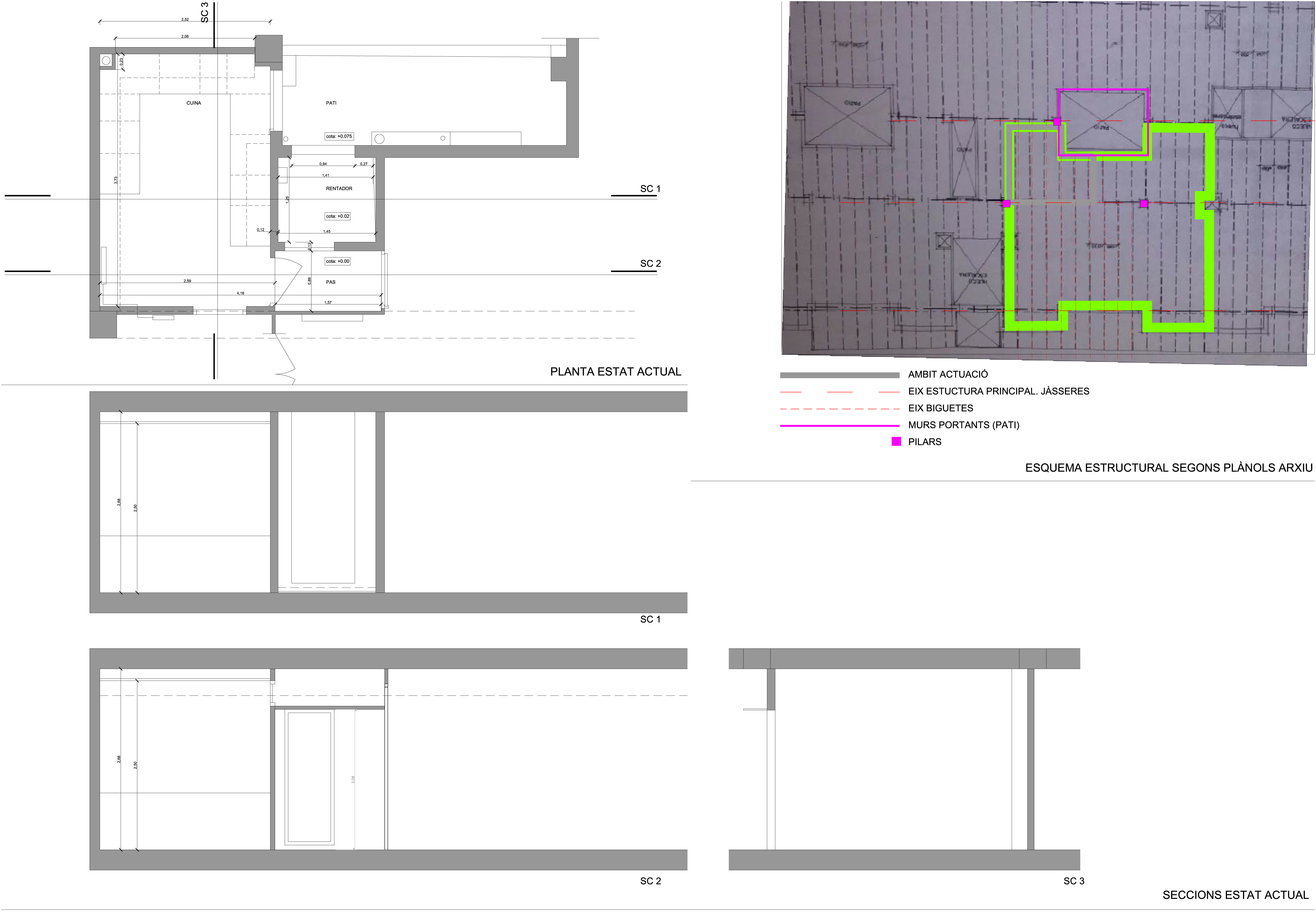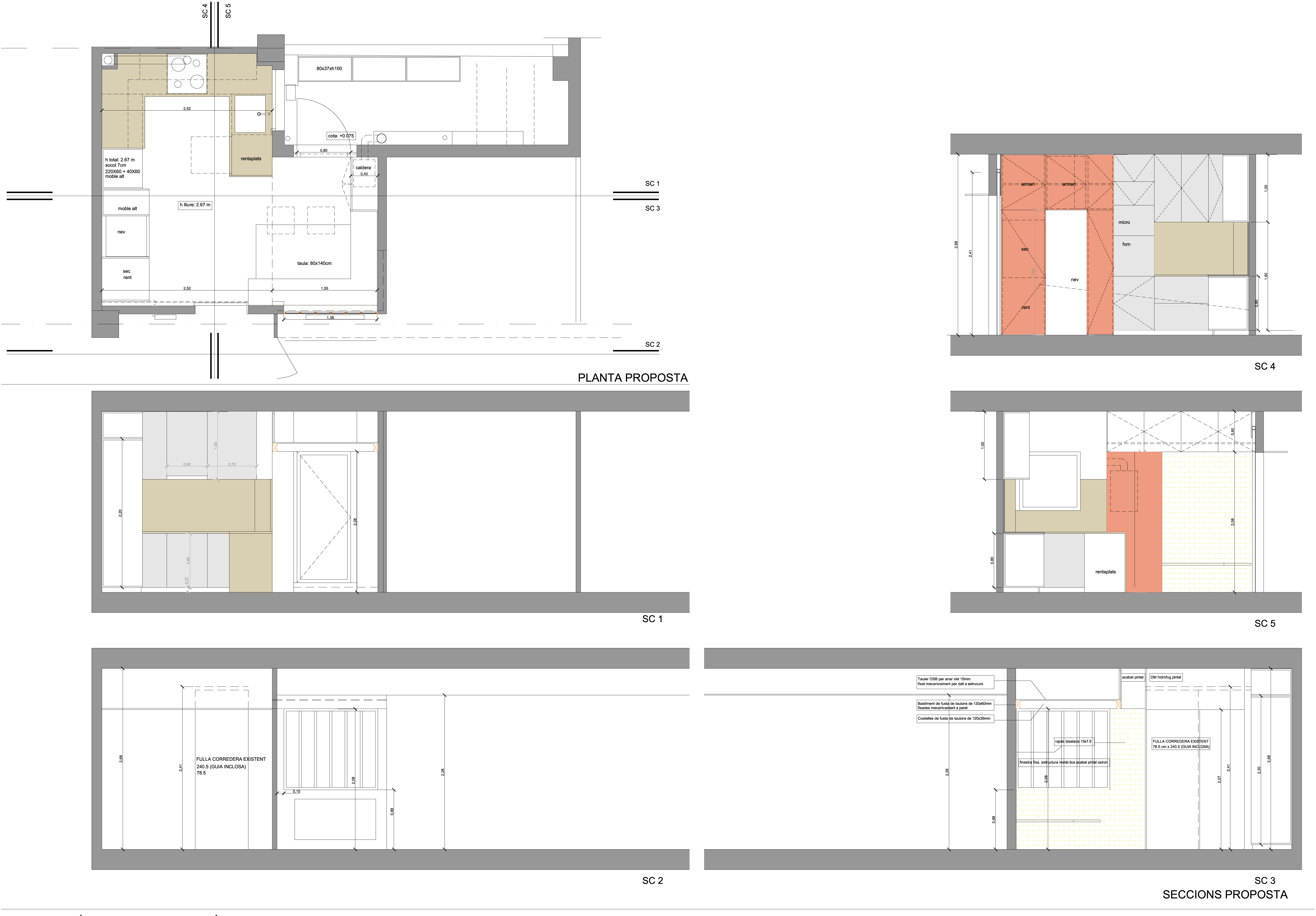Solució: S’amplia la superfície de la cuina incorporant el rentador, guanyant una zona d’office. Es crea una obertura vidriada entre la sala i la cuina per tal de crear una transparència que donarà amplitud al conjunt de l’habitatge. La cuina es redistribueix per tal d’optimitzar el volum d’emmagatzematge i es crea a més un nou altell d’emmagatzematge a la zona d’office.