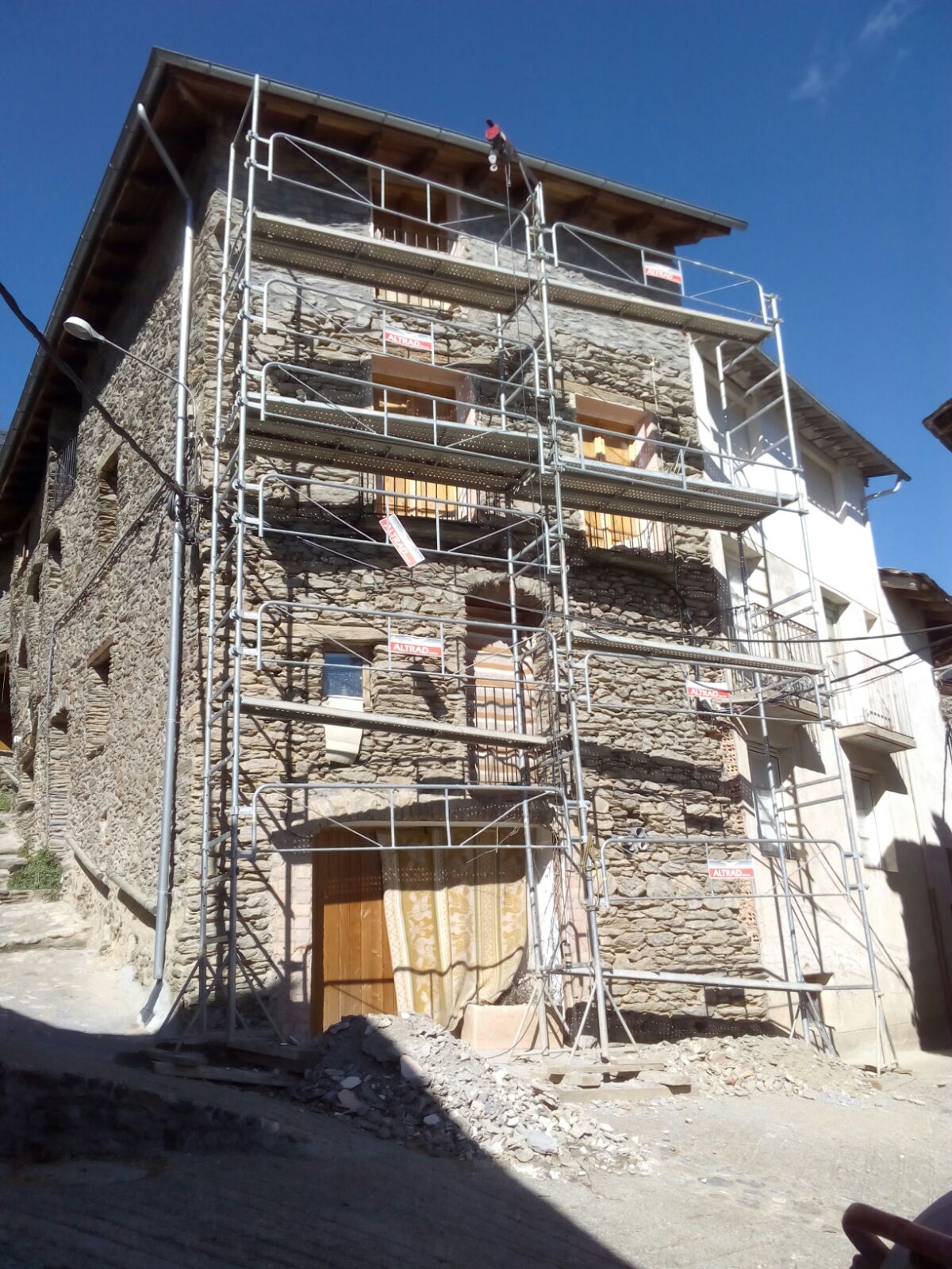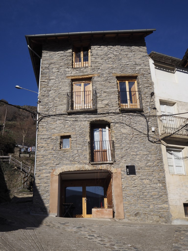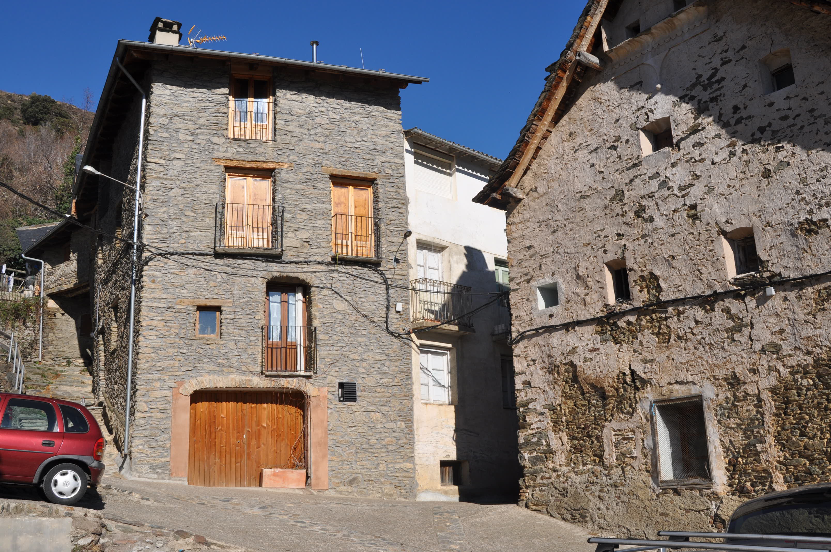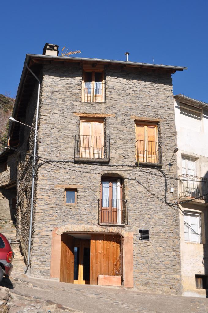 Premisses: Rehabilitació de façana d’un habitatge unifamiliar entre mitgeres a Surp (Rialp) Pallars Sobirà. Edifici d’arquitectura tradicional amb façana de pedra de pissarra. La premissa principal era la recuperació de la pedra vista de la façana principal, que en l’estat actual estava revestida amb un arrebossat monocapa.